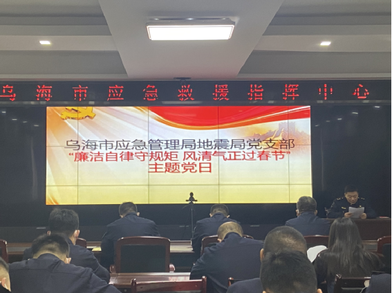 在2023年新春佳节即将来临之际,为进一步引导教育党员发挥党员先锋模范作用,筑牢广大党员思想防线,为党员打好廉洁过节“预防针”。1月19日,中共乌海市应急管理局委员会地震局党支部组织全体党员干部开展“廉洁自律守规矩 风清气正过春节”主题党日活动,活动对廉洁过节提出明确要求。