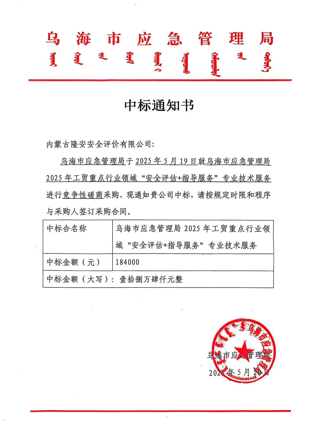 中标单位:内蒙古隆安安全评价有限公司